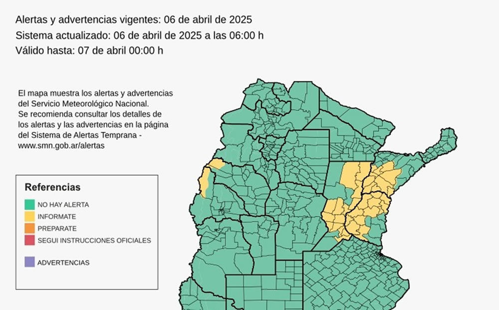 El Servicio Meteorológico Nacional emitió un alerta amarilla por lluvias y tormentas, que regirá este domingo para gran parte del territorio provincial. Los departamentos afectados son La Paz, Federal, Feliciano, Federación, Concordia, San José, Paraná, Villaguay, Diamante, Nogoyá, Victoria y Gualeguay.