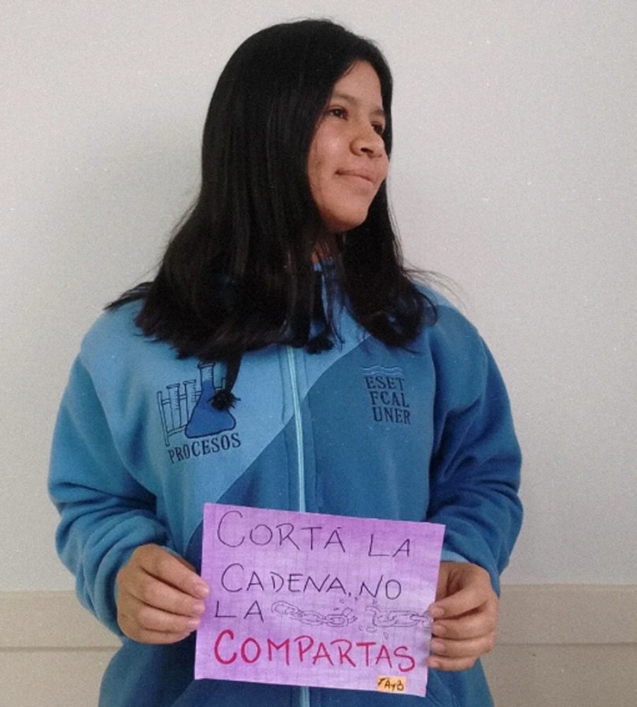 Entre los mensajes expuestos en las redes sociales, los alumnos se dejan ver con pancartas que rezan escritos tales como «Cortá la cadena, no compartas», «La educación empieza por casa» y «Cuidarnos es tarea de todos»; entre otros.