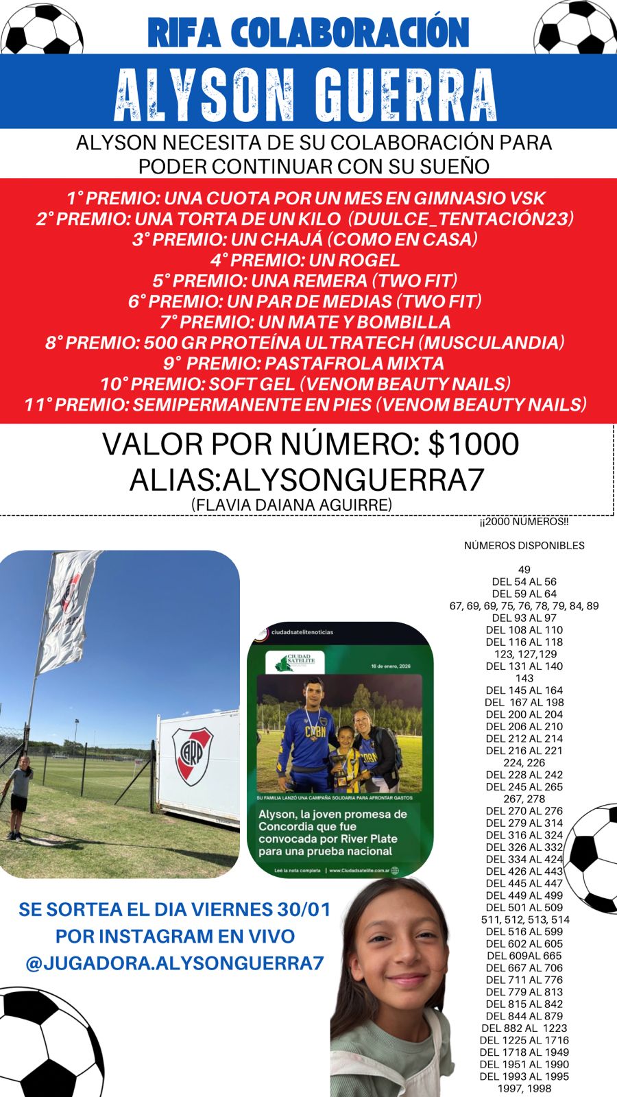 Actualmente, Alyson juega en la categoría 2015 masculina, integra la Sub 12 del femenino y también entrena con la Primera División, una muestra clara de su proyección y compromiso con el deporte. Sin embargo, el sueño conlleva un esfuerzo económico importante. Por eso, la familia organizó una rifa solidaria para poder afrontar los gastos de viaje y estadía: “Tenemos 2.000 números a $1000, con 11 premios donados por comercios y familiares de Concordia. Por ahora vendimos unos 150, así que todavía queda mucho por recorrer”, contó Flavia. Quienes deseen colaborar pueden comunicarse al 3455-008288 (Flavia) o al 3455-008292 (Carlos, su papá), y también seguir a la joven futbolista en Instagram: @jugadora.alysonguerra7.