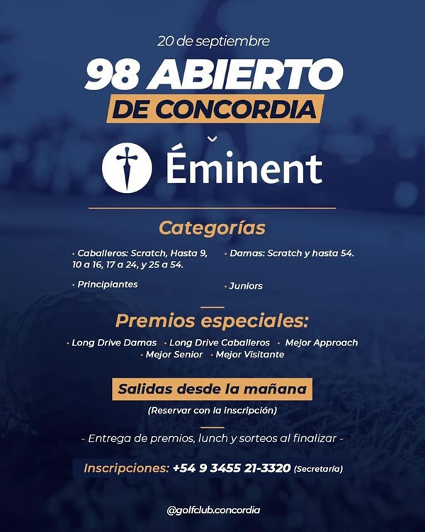 Hoy sábado 20 de septiembre se lleva a cabo una nueva edición del Abierto de Concordia en las instalaciones del Concordia Golf Club. Es la 98° edición de este tradicional certamen, que vuelve a reunir a golfistas locales, principiantes y visitantes de distintas ciudades, incluso del exterior.