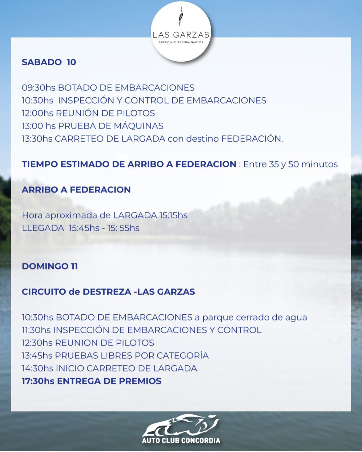 La acción comenzará el sábado a las 9:30hs, mientras que la largada hacia Federación está prevista para las 15:00hs. El domingo, la jornada se iniciará a las 10:30hs y concluirá con la ceremonia de premiación a las 17:30hs.