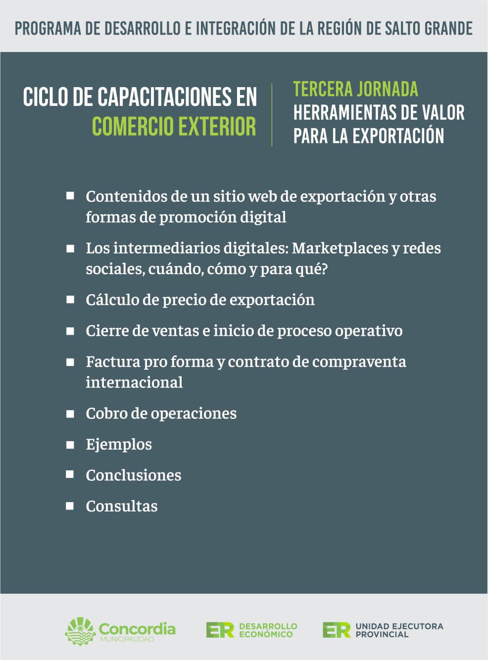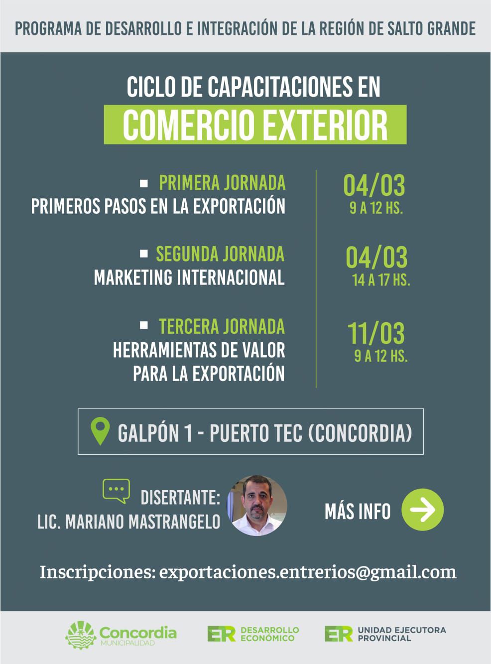 Durante el mes de marzo, Concordia será sede del Ciclo de Capacitaciones en Comercio Exterior, una propuesta formativa destinada a emprendedores, pymes y empresas que buscan iniciar o fortalecer sus procesos de internacionalización, en el marco del Programa de Desarrollo e Integración de la Región de Salto Grande.