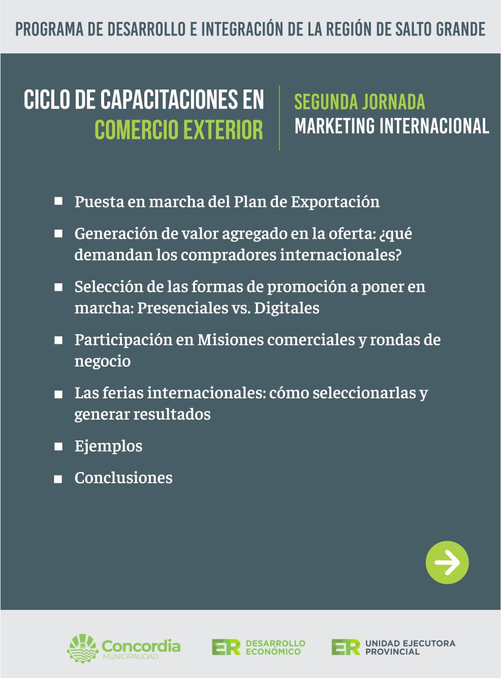 La iniciativa se desarrollará a través de tres jornadas de capacitación presencial, que tendrán lugar en el Galpón 1 – Puerto TEC (Concordia), y abordará contenidos estratégicos vinculados a los primeros pasos en la exportación, el marketing internacional y las herramientas de valor necesarias para consolidar operaciones comerciales en mercados externos.