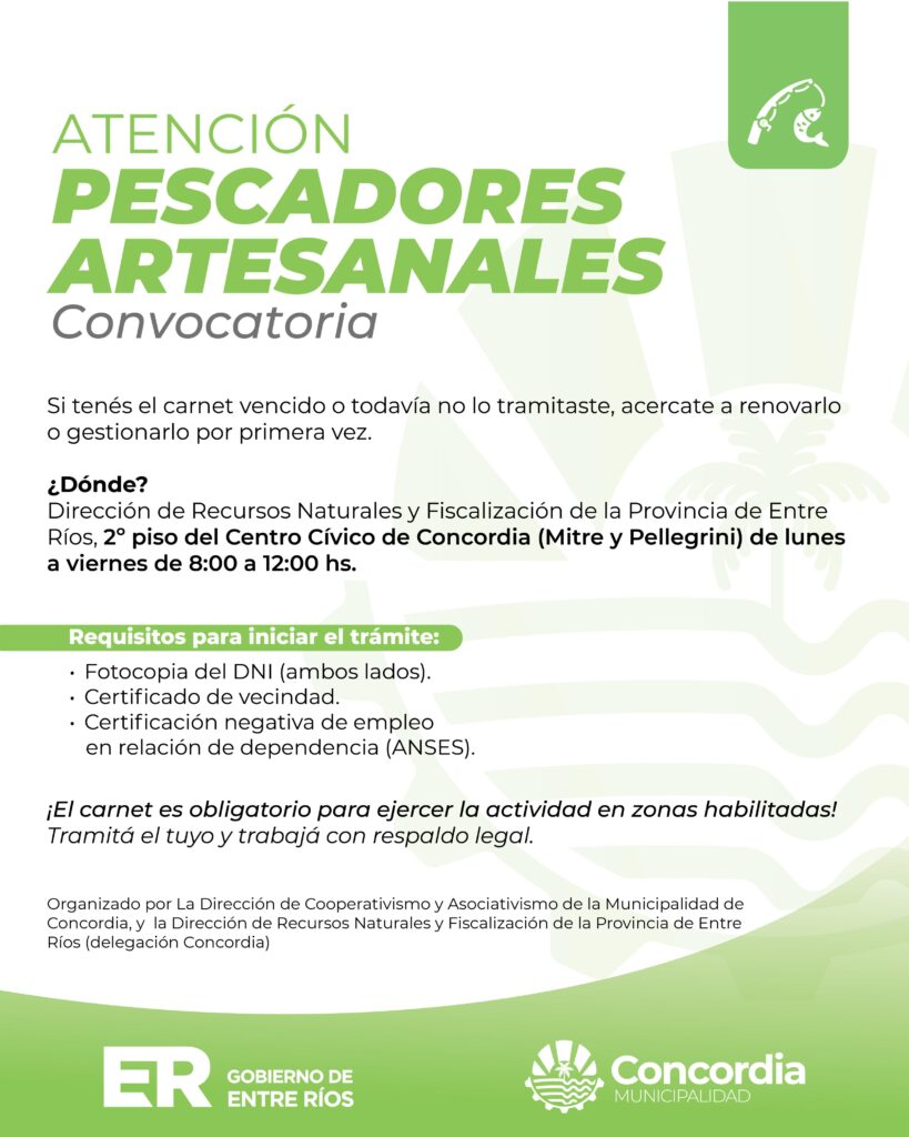La Dirección de Cooperativismo y Asociativismo de la Municipalidad de Concordia, en conjunto con la Dirección de Recursos Naturales y Fiscalización de la Provincia de Entre Ríos (delegación Concordia), informa que se encuentra abierta la convocatoria a pescadores artesanales para la renovación o tramitación del Carnet de Pescador Artesanal, documento obligatorio para ejercer esta actividad en zonas habilitadas.