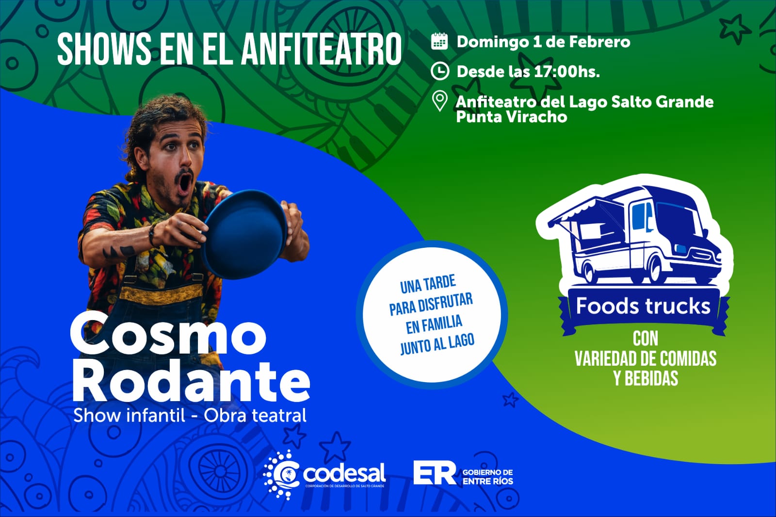 Este domingo 1 de febrero, a partir de las 17 horas, el anfiteatro del Lago de Salto Grande será sede de un evento recreativo y cultural organizado por la Corporación de Desarrollo de Salto Grande (CODESAL), con entrada libre y gratuita, pensado para disfrutar en familia.