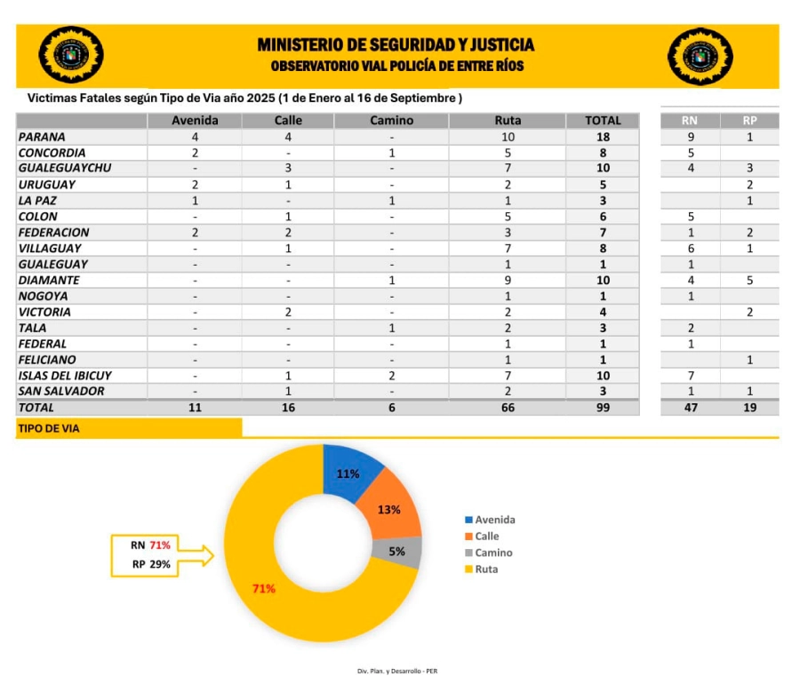 Según los registros de la Policía Científica, en lo que va de 2025 se produjeron 572 siniestros en la provincia. Como consecuencia, se contabilizaron 99 víctimas fatales, de las cuales 66 perdieron la vida en rutas nacionales y provinciales. Además, los choques dejaron 530 personas con lesiones graves y 220 con lesiones leves, lo que implica un fuerte impacto tanto en las familias como en el sistema sanitario entrerriano.