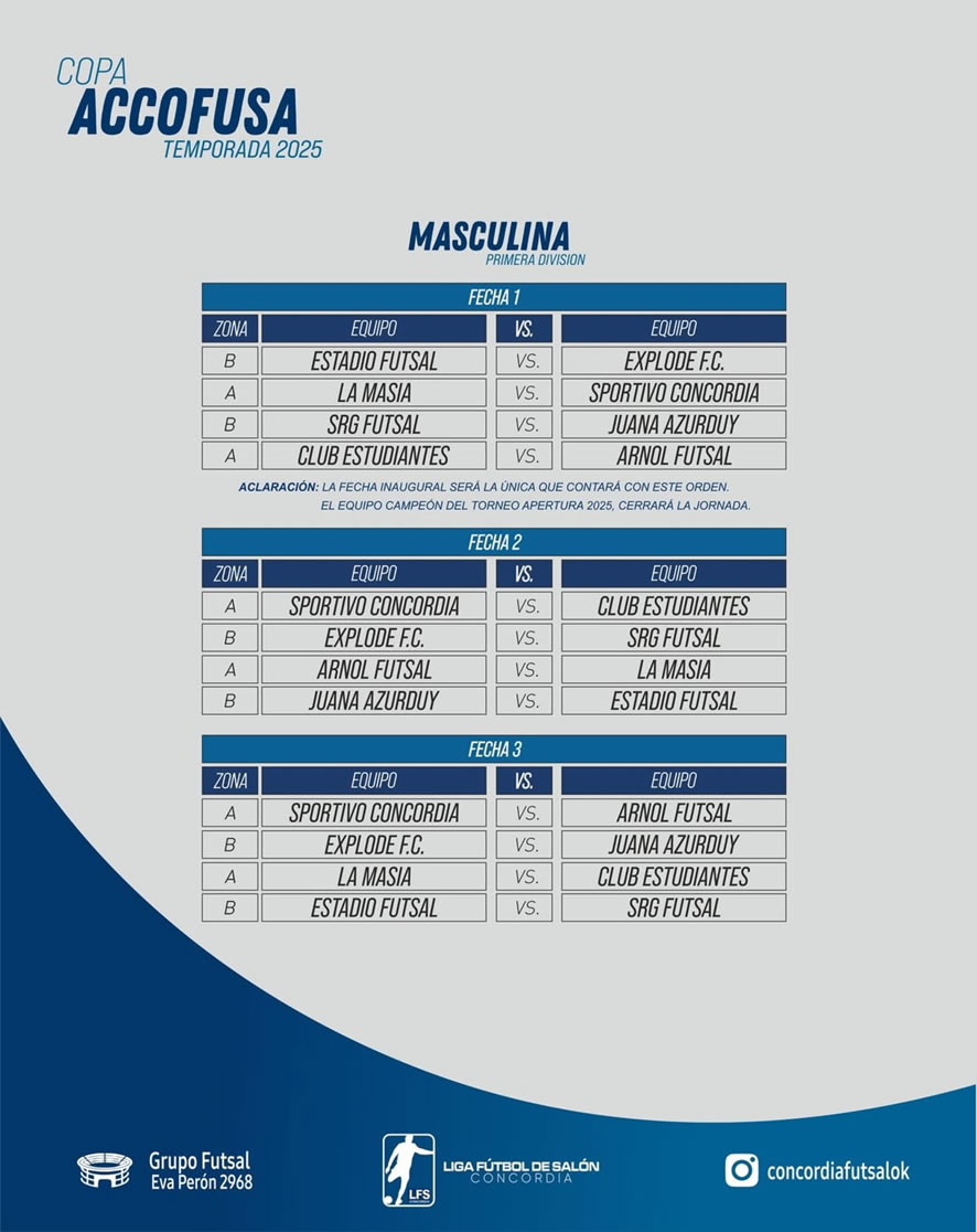 La espera terminó y la redonda vuelve a rodar en la cancha del Grupo Futsal. Este domingo desde las 12 del mediodía se pondrá en juego la Copa ACCOFUSA temporada 2025. Serán 8 equipos distribuidos en 2 zonas, siendo cabeza de series Estudiantes (Campeón) y SRG Futsal (Subcampeón).