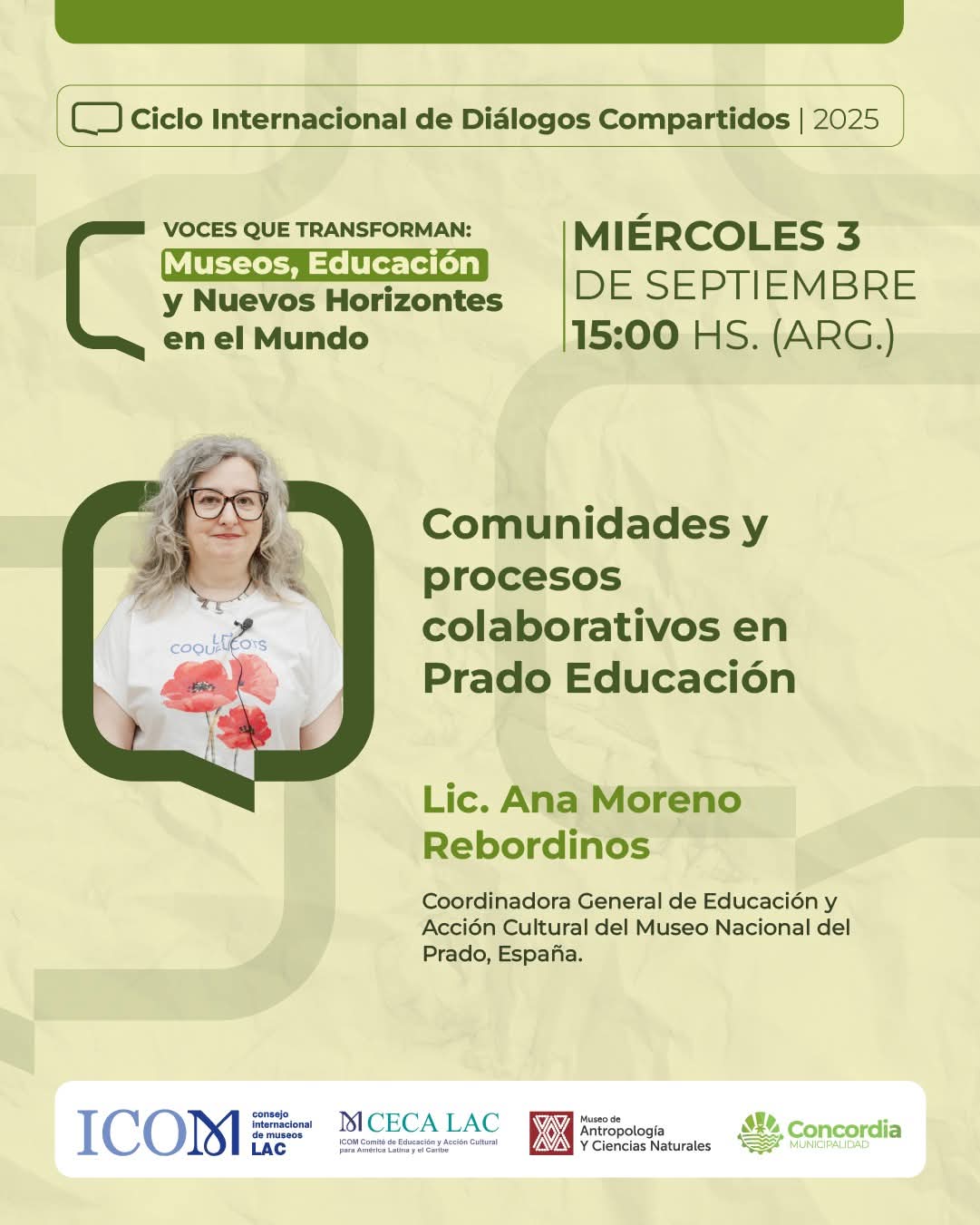 El evento, organizado por el Museo de Antropología y Ciencias Naturales dependiente de la Subsecretaría de Turismo del Municipio local en conjunto con el Comité de Educación y Acción Cultural para Latinoamérica y el Caribe (CecaLac) del Consejo Internacional de Museos (ICOM) , y avalado por Alianza Regional para Latinoamérica y el Caribe del ICOM (ICOM Lac), culmina con la ponencia de la Dra. ANA MORENO REBORDINOS, Coordinadora General de Educación y Acción Cultural del Museo Nacional del Prado, España.