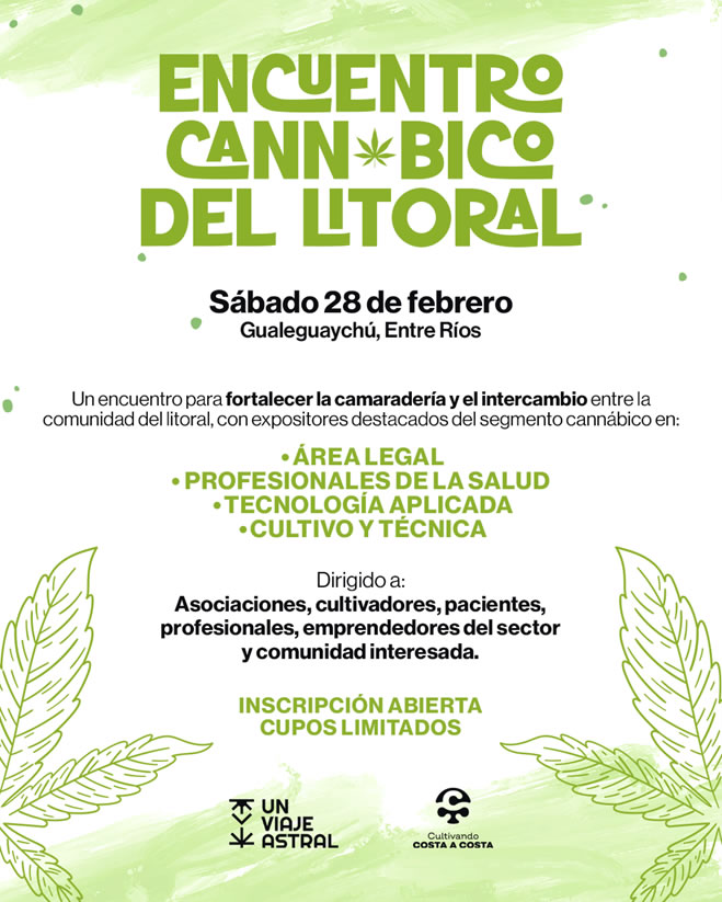 El sábado 28 de febrero, Gualeguaychú será sede del Encuentro Cannábico del Litoral, una jornada que reunirá a organizaciones, profesionales de la salud, investigadores, cultivadores y emprendedores para debatir ciencia, salud, marco legal, producción y usos del cannabis en la región.