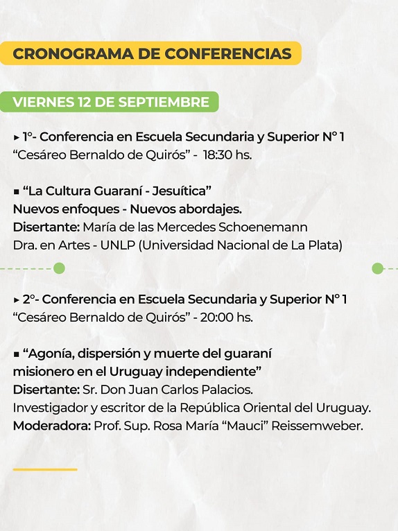 Posteriormente, la segunda conferencia del día viernes, a las 20, será expuesta bajo el título de “AGONÍA, DISPERSION Y MUERTE DEL GUARANÍ MISIONERO EN EL URUGUAY INDEPENDIENTE” a cargo de Don Juan Carlos Palacios, investigador y escritor de la ciudad de Salto, República Oriental del Uruguay. Dicha conferencia contará con una introducción a cargo de la Prof. Sup. Rosa María “Maucy” Reissemweber.