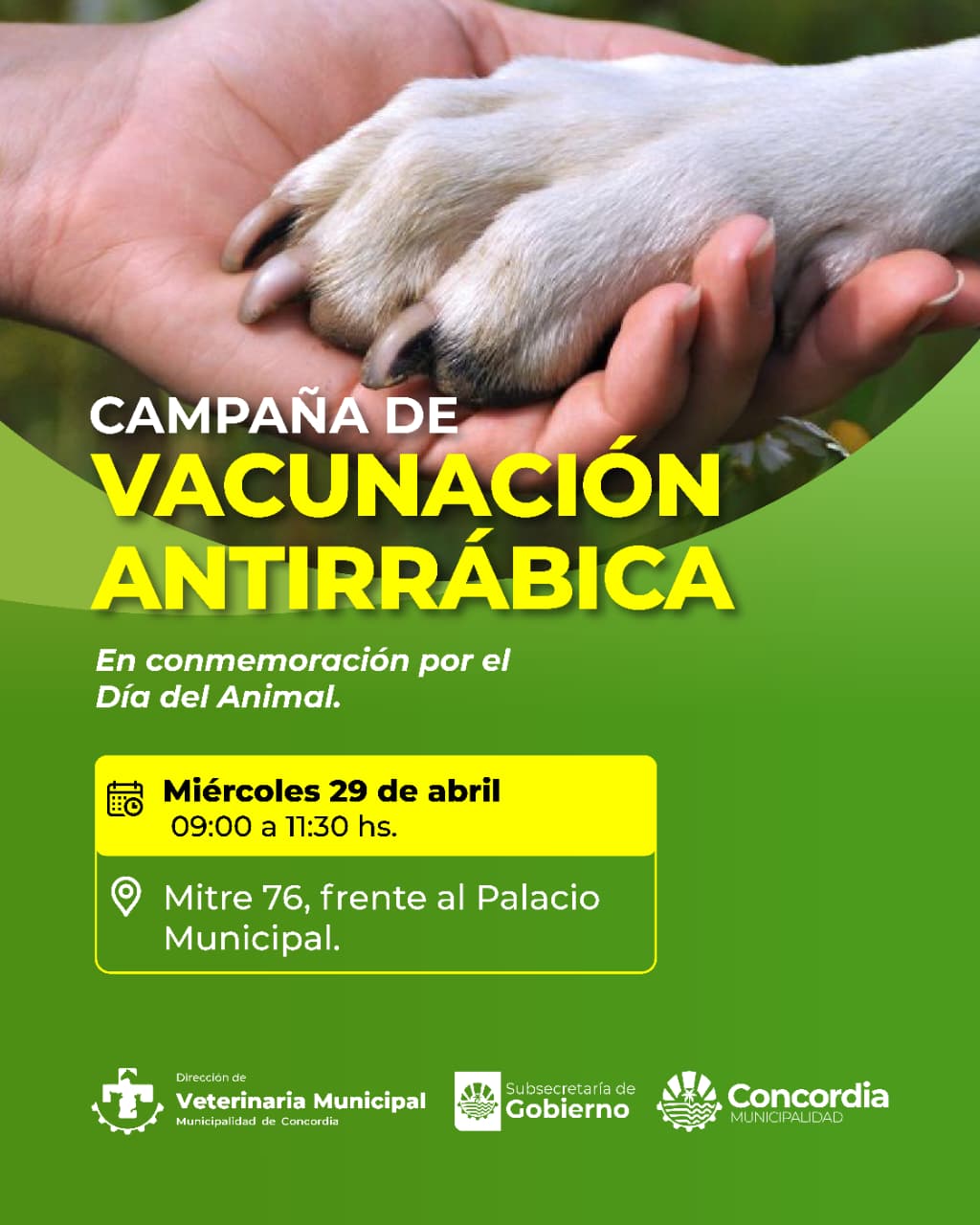 La Dirección de Veterinaria de la Municipalidad de Concordia informa que el próximo miércoles 29 de abril, Día del Animal, llevará adelante una Campaña de Vacunación Antirrábica.