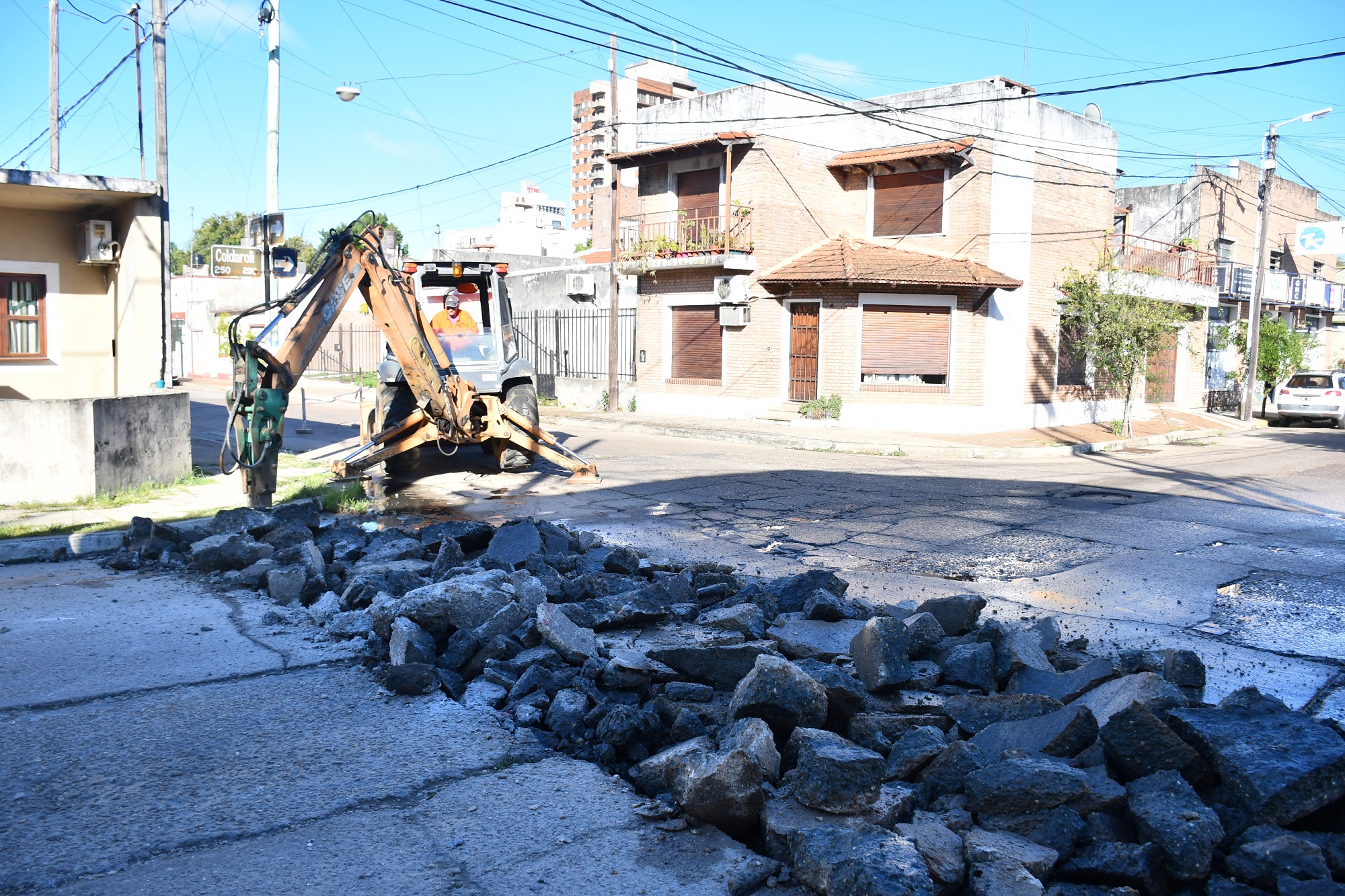 En calle Coldaroli y La Rioja se realizan trabajos de bacheo. “Acá el problema fue histórico debido a una vertiente. Por eso se está haciendo un trabajo con un lecho filtrante, con geotextil. También se va a encauzar el agua y replantear todos los niveles de badenes” explicó Esquibel.