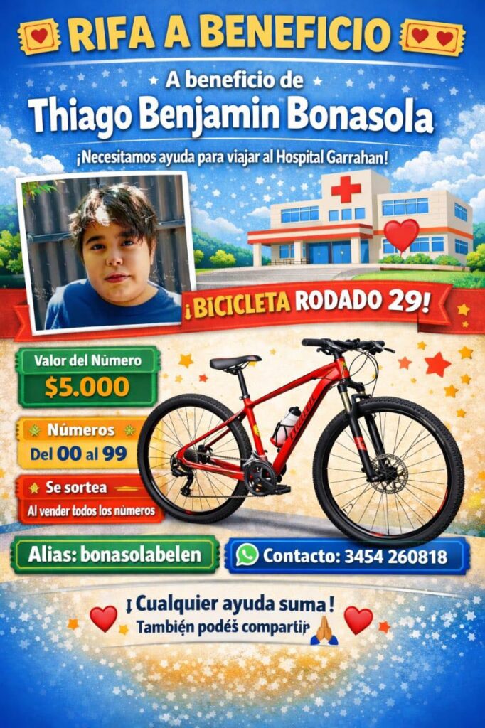 Por eso, iniciaron una campaña solidaria para poder viajar a Buenos Aires y continuar con el tratamiento de Benjamín. Actualmente, también están realizando una rifa solidaria de una bicicleta rodado 29, con un valor de 5.000 pesos por número.