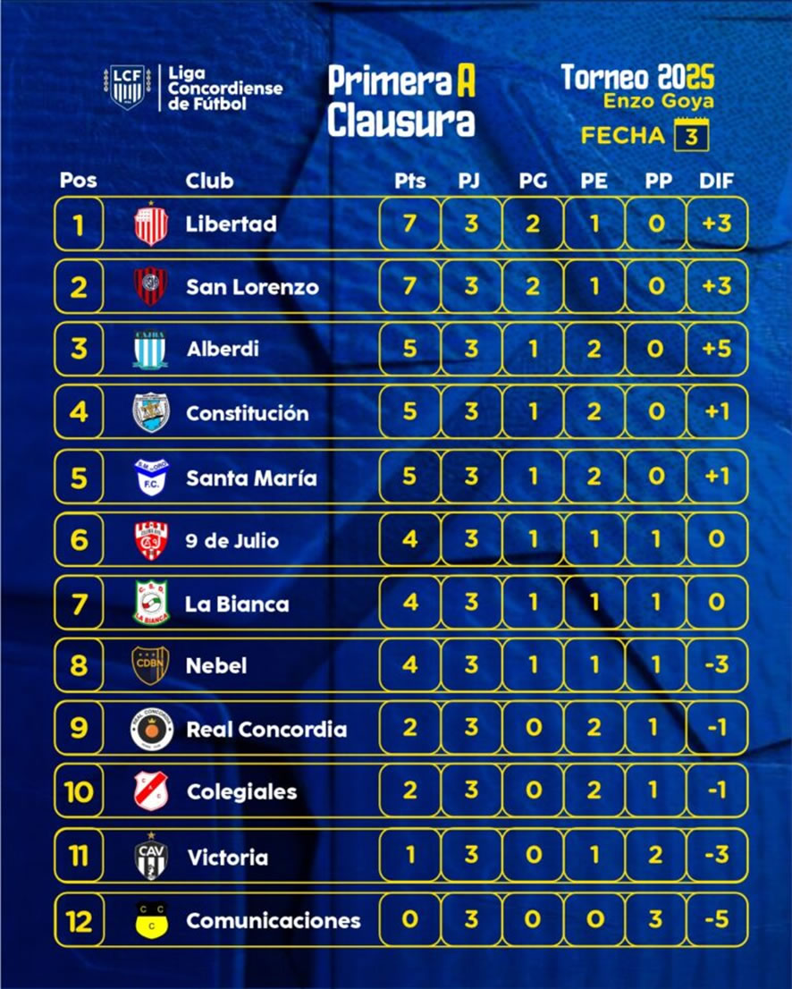 Libertad y San Lorenzo punteros tras la tercera del Clausura de la Liga Concordiense