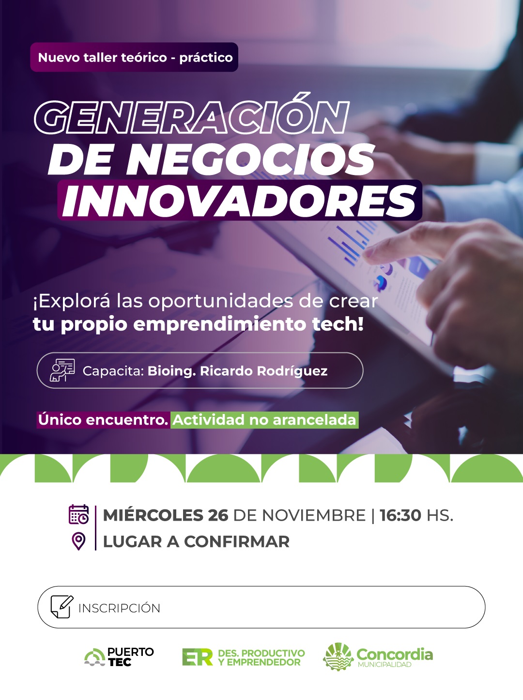 La Municipalidad de Concordia, a través de la Dirección de Innovación y Economía del Conocimiento, realizará el próximo miércoles 26 de noviembre a las 16:30 horas, el taller “Generación de Negocios Innovadores”, una propuesta destinada a estudiantes universitarios de carreras vinculadas a la tecnología y a jóvenes interesados en desarrollar ideas con potencial emprendedor.