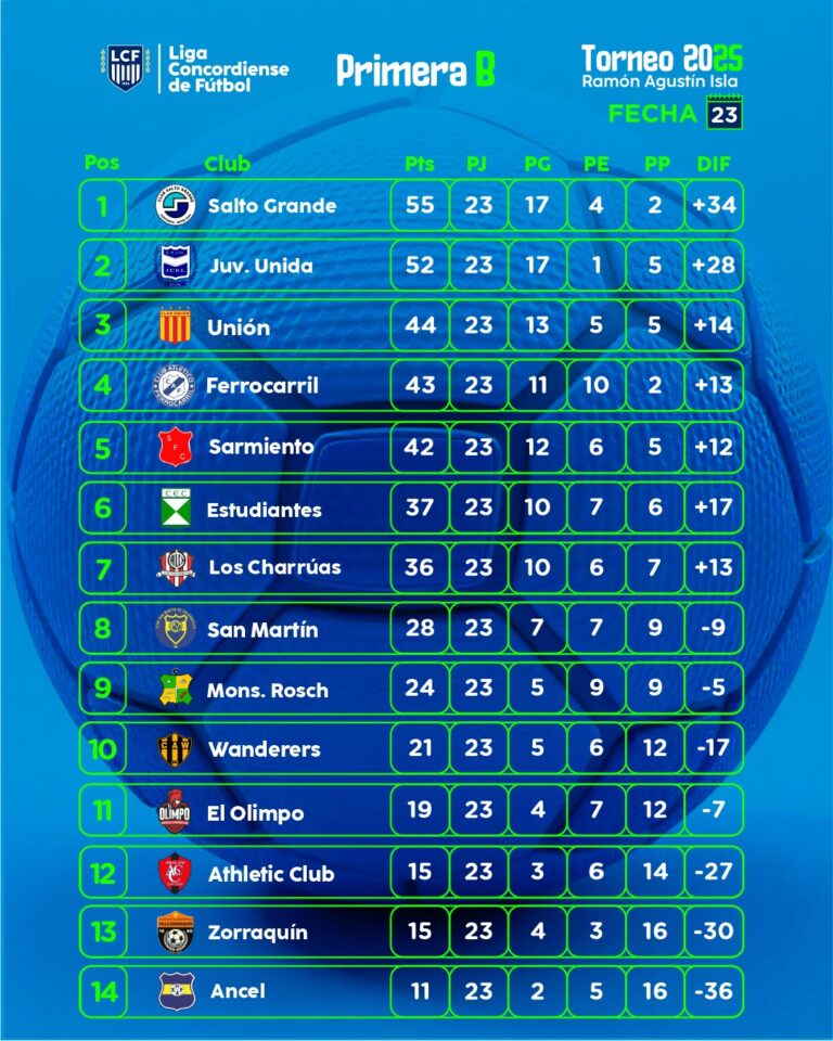 Además, la fecha 23 tuvo los siguientes resultados: Unión derrotó 4 a 1 a San Martín, Ferrocarril doblegó 2 a 0 al Athletic Club, Estudiantes venció 2 a 1 a Sarmiento, Atlético Charrúas goleó 5 a 1 a Ancel, Monseñor Rosch hizo lo propio al imponerse 5 a 0 a Villa Zorraquin y El Olimpo batió 1 a 0 a Wanderer´s.