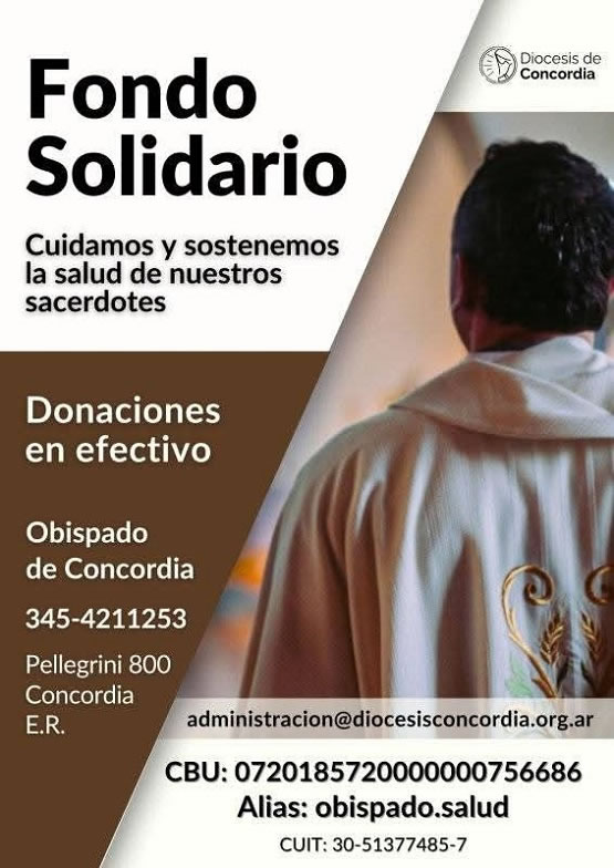 La colaboración (a lo largo de todo el año) puede efectuarse personalmente en sede del obispado (Pellegrini 800 de Concordia) o con un depósito al CBU que figura en el flyer (alias: obispado.salud).