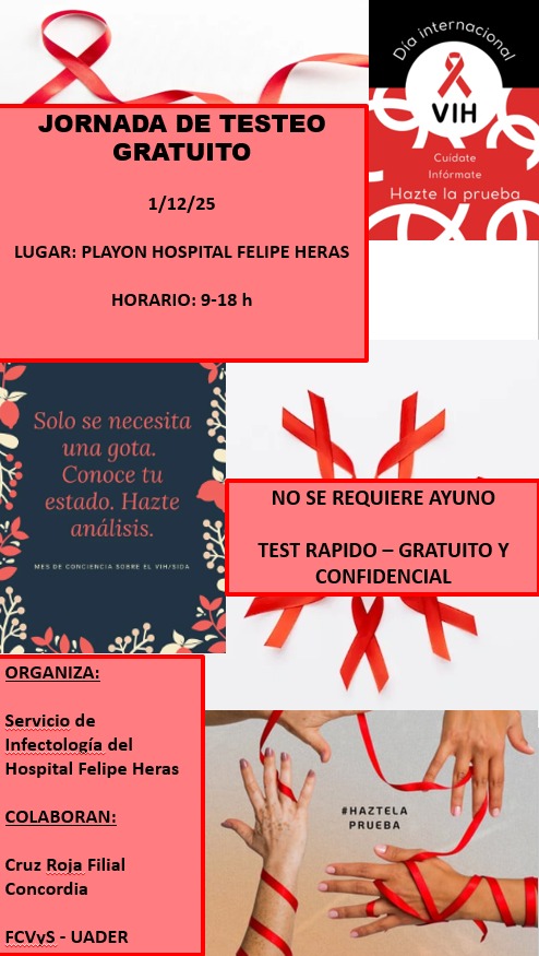En el marco del Día Mundial del Sida, el Servicio de Infectología del hospital «Felipe Heras» de Concordia, en colaboración con la Cruz Roja filial Concordia y la FCVyS de la UADER, llevará a cabo una jornada de testeo rápido gratuito y confidencial.
