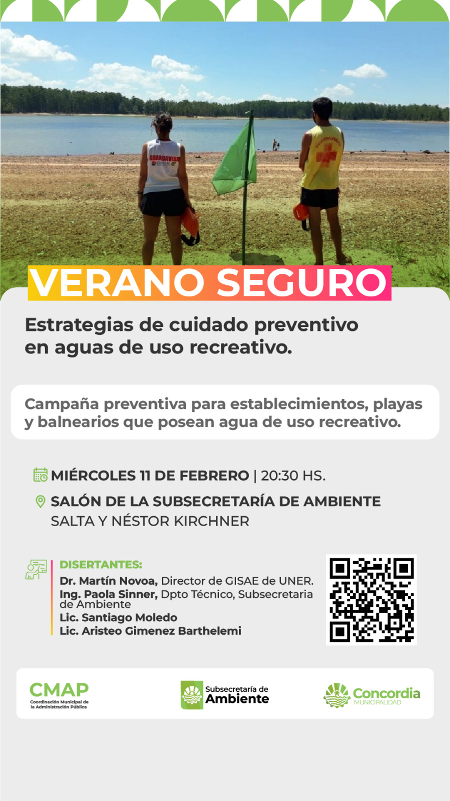 La actividad está destinada a guardavidas que se desempeñan en playas, balnearios y espacios con aguas de uso recreativo y contará con las disertaciones del equipo del Departamento Técnico de la Subsecretaría de Ambiente; del Dr. Martín Novoa, especialista en floraciones algales y Director del GISAe y del Laboratorio de Aguas y Efluentes de la UNER; del Dr. Guillermo Saucedo, médico toxicólogo y de los Licenciados Santiago Moledo y Aristeo Giménez Barthelemi.