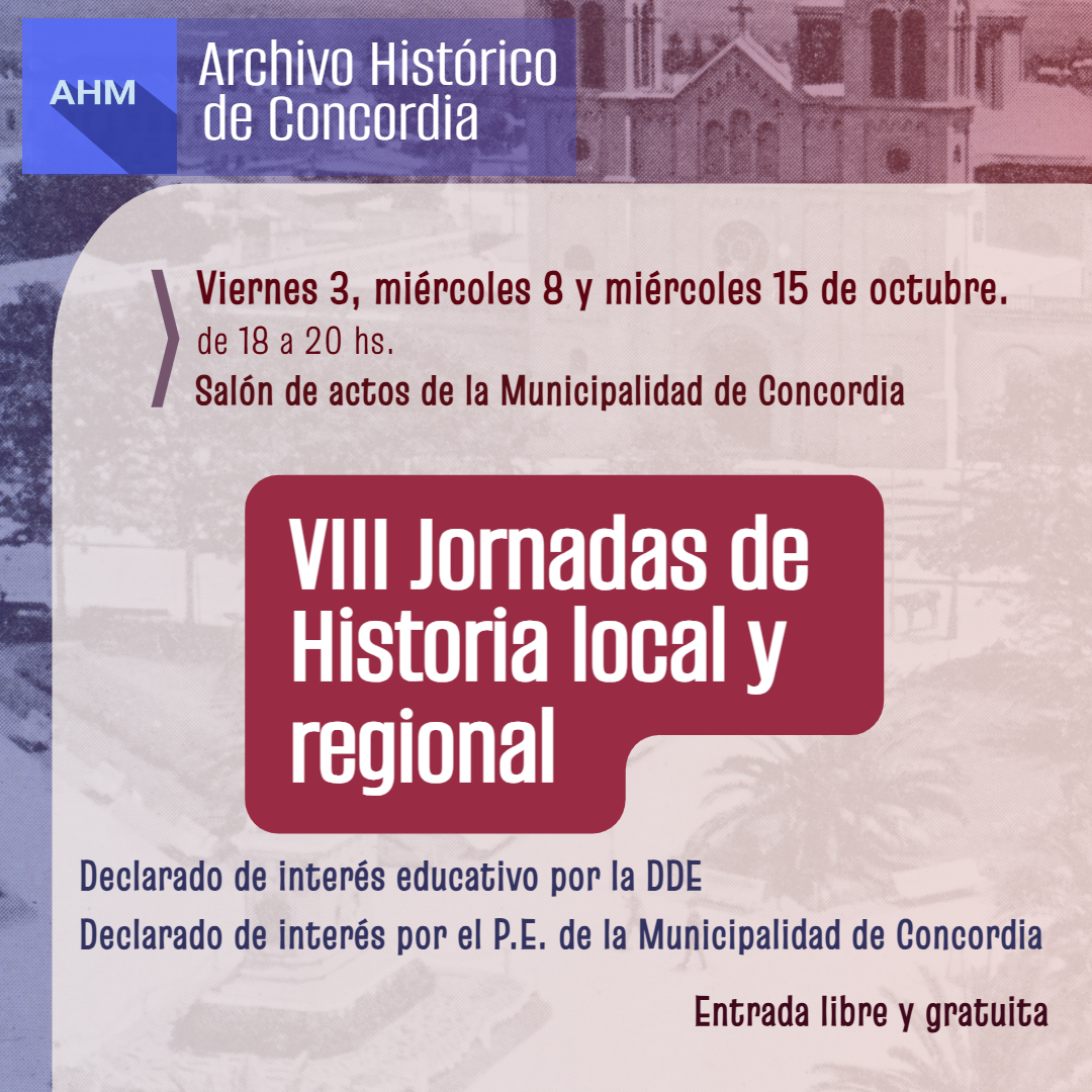 El Archivo Histórico de la Municipalidad de Concordia, comunica la realización de las “VIII° Jornadas de Historia local y regional”, los días 3, 8 y 15 de octubre.
